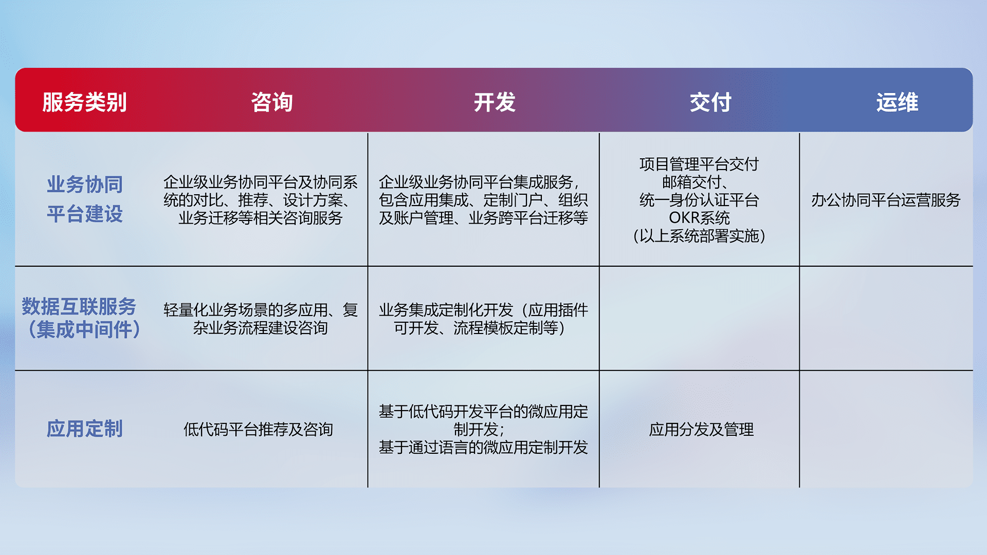 针对钉钉、、、企微、、、IDaas等平台级产品提供产品的规划、、、方案、、、、交付、、定制化开发等服务,,,实现如统一协同办公、、、智能客户服务、、、混合会议管理、、、智能数据查询、、等业务场景,,,实现数字化转型。。。